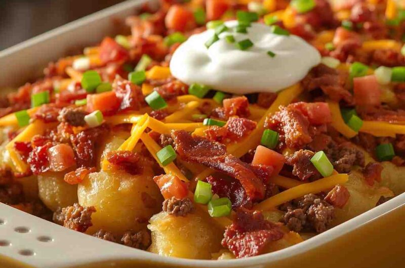 Loaded Baked Potato Casserole takes everything you love about a classic baked potato — creamy mashed potatoes, melted cheese, crispy bacon, and tangy sour cream — and layers it into one hearty, oven-baked dish.