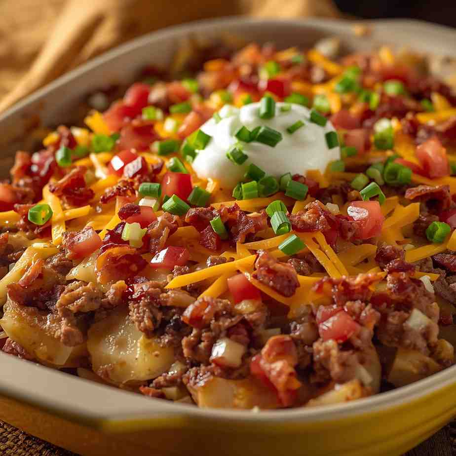 Loaded Baked Potato Casserole is a cozy, crowd-pleasing dish that captures all the deliciousness of a loaded baked potato in a convenient, shareable form. Creamy mashed potatoes, melted cheese, smoky bacon, and tangy sour cream come together for an irresistibly rich, comforting experience.