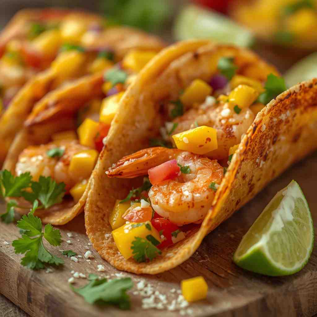 • Step 5: Assemble the Tacos : Place a small layer of shredded cabbage or lettuce on each tortilla. Top with 3–4 shrimp, a generous spoonful of mango salsa, and avocado slices if desired.