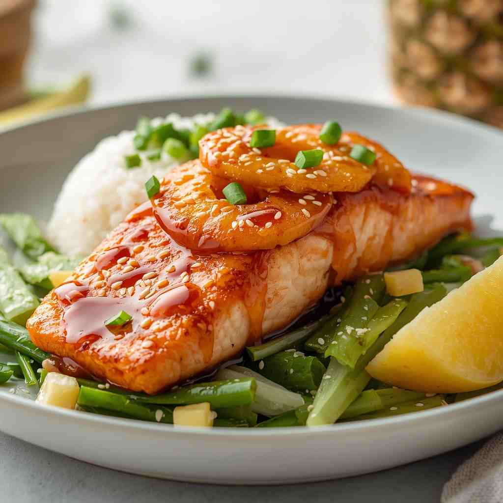 - Step 4: Serve : Place salmon on a serving plate with steamed rice and vegetables. Drizzle with extra sauce and garnish with green onions, pineapple chunks, and sesame seeds.