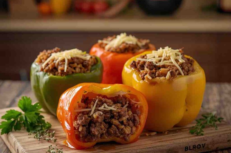 Stuffed Bell Peppers with Ground Beef and Rice is a classic comfort-food dish that beautifully balances nutrition, flavor, and presentation. Colorful bell peppers are hollowed and filled generously with a hearty mixture of seasoned ground beef, tender rice, tomatoes, and melted cheese. Every bite offers a delightful combination of textures — the soft pepper exterior encasing the savory, juicy filling.