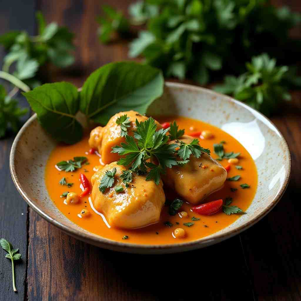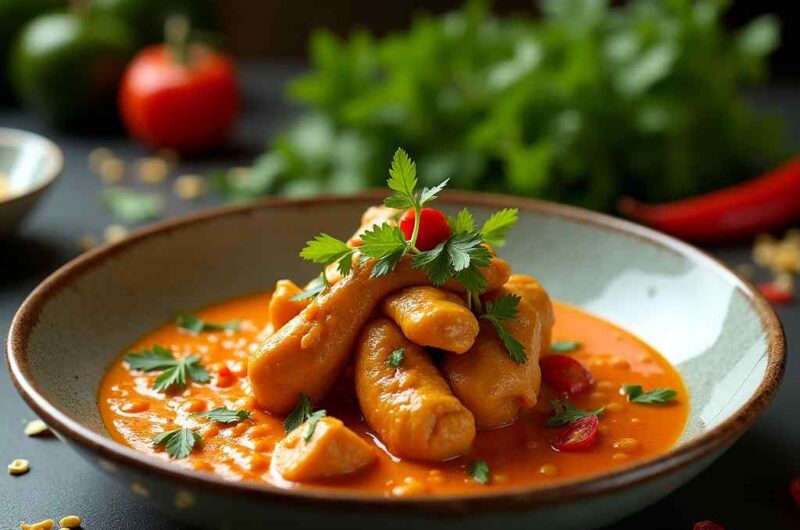 - Step 5: Add Peanuts and Seasoning : Stir in fish sauce, sugar, ground peanuts, chili flakes (if using), red bell pepper, and sliced kaffir lime leaves. Simmer for 10–12 minutes until the sauce thickens and the chicken is tender.