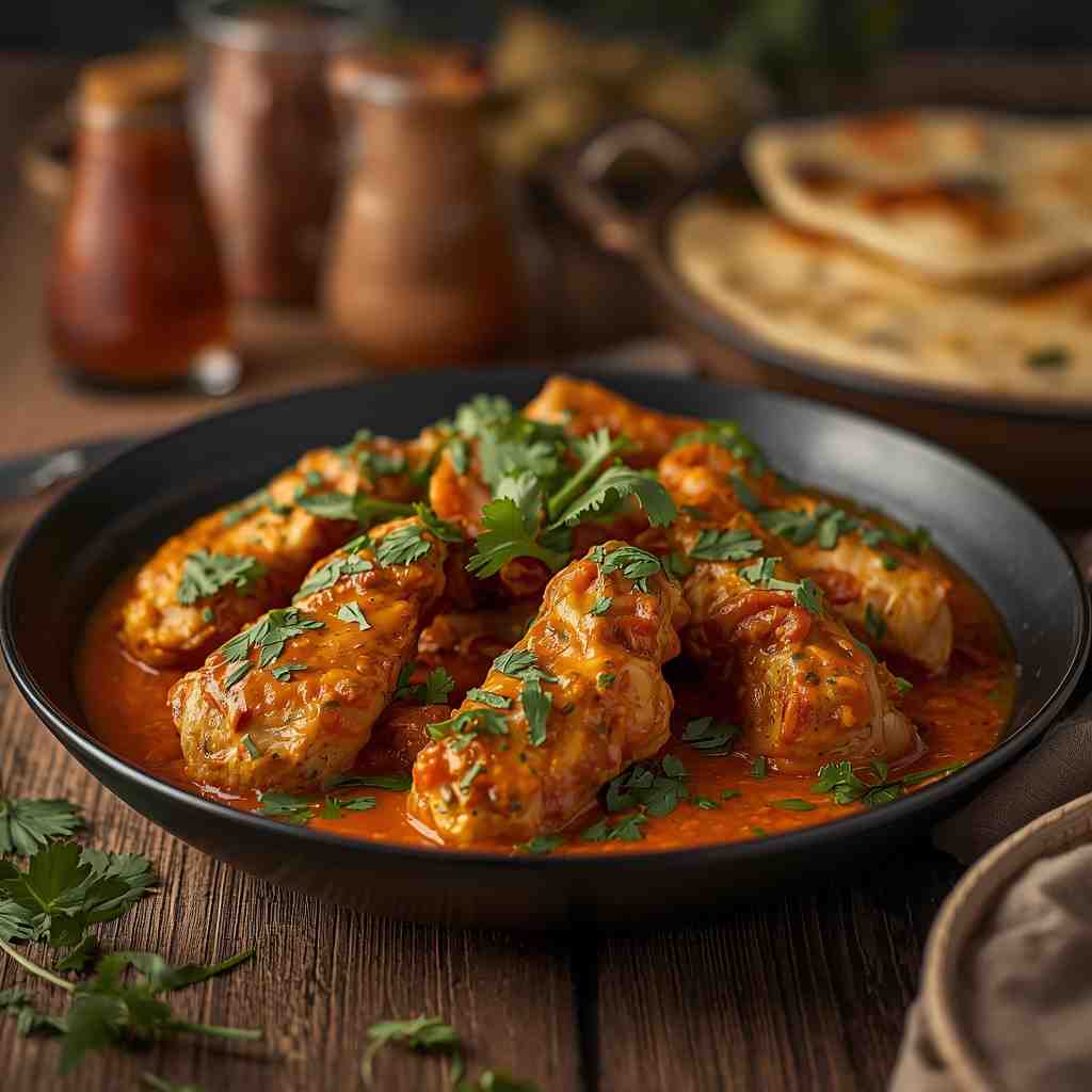 Serve butter chicken in a deep bowl with a drizzle of cream and a sprinkle of cilantro. Place warm garlic naan on the side — brushed fresh with garlic butter. Optionally serve with basmati rice or cucumber raita.