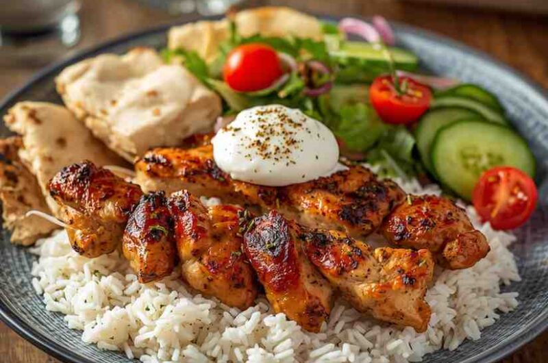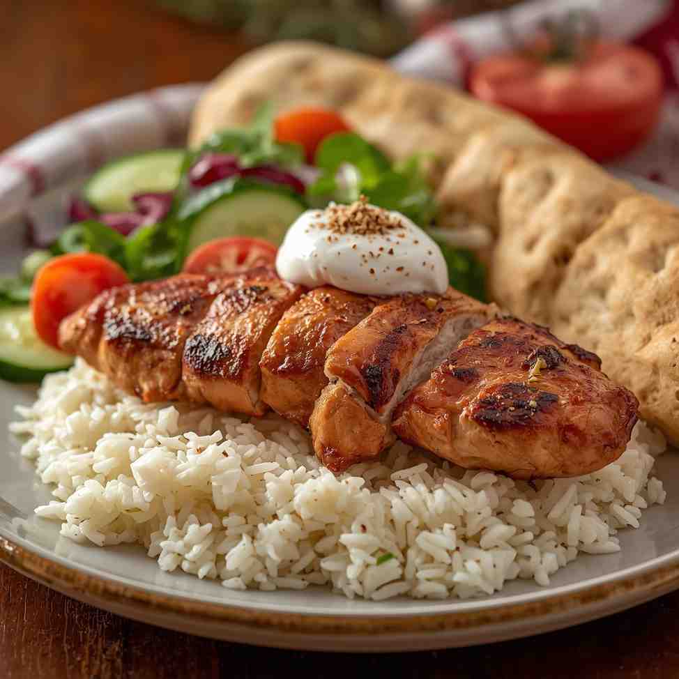 - Step 5 – Assemble the Plate : Place a bed of rice on each plate. Arrange sliced chicken on top. Add salad to the side. Drizzle garlic or tahini sauce and garnish with lemon wedges, pickles, or olives.