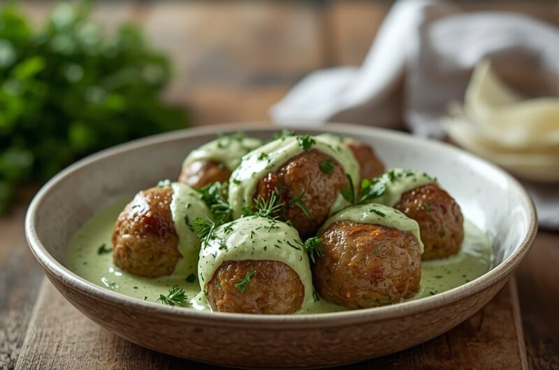- Make the Sauce: In a food processor, combine parsley, basil, chives, mayonnaise, sour cream, garlic, lemon juice, lemon zest, and anchovy (if using). Blend until smooth. Season with salt and pepper. Chill in the fridge while making meatballs.