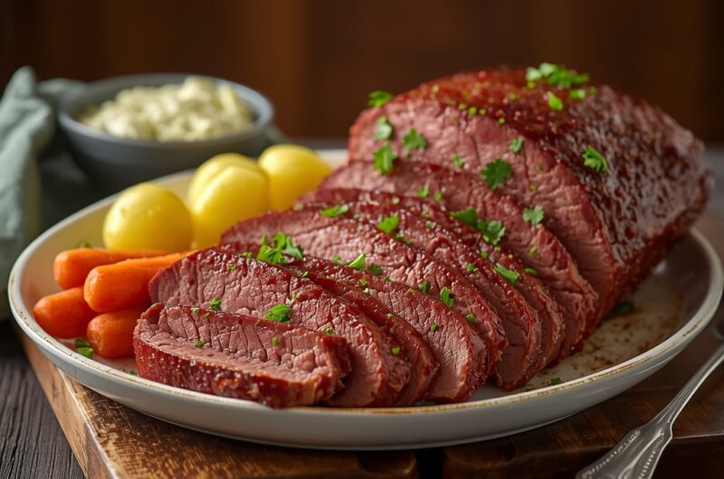 • Slice and Serve Remove the corned beef and let it rest for 5–10 minutes. Slice the corned beef against the grain into ½-inch thick slices. Serve with the cooked vegetables, garnished with fresh parsley if desired.