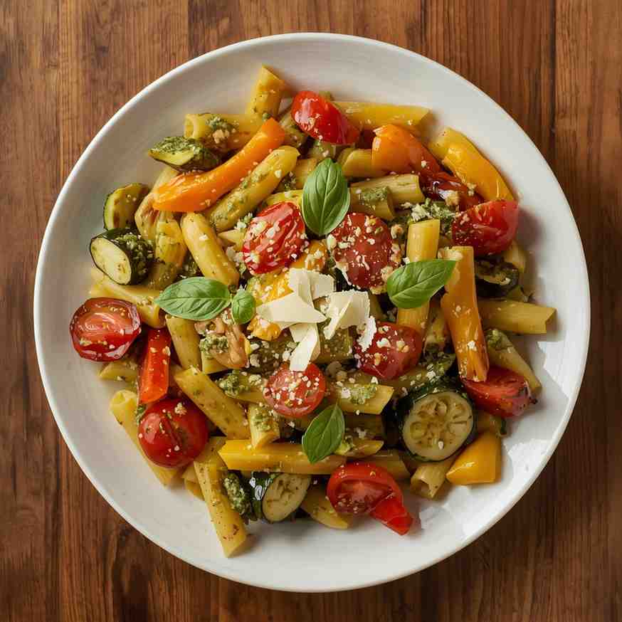 Serve Roasted Vegetable and Pesto Pasta as a main course with a side of garlic bread or a fresh green salad. It can also be served cold as a pasta salad for picnics or meal prep. A crisp white wine, such as Pinot Grigio or Sauvignon Blanc, pairs beautifully with the herbaceous pesto and roasted flavors.
