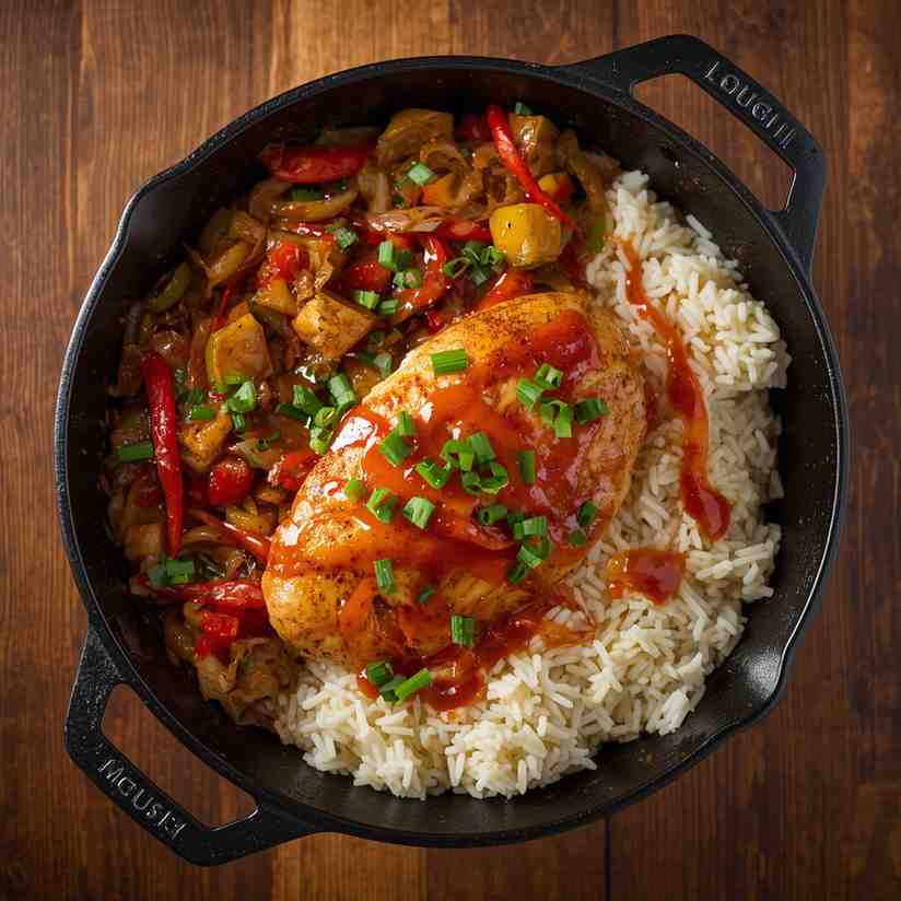 Spicy Cajun Chicken and Rice Skillet is a bold, flavorful one-pan dish that brings the heat and savory depth of Cajun cuisine to your dinner table. Juicy chicken breasts are seasoned with a robust blend of Cajun spices, then seared to perfection and combined with fluffy rice, sautéed vegetables, and a rich, spicy sauce.