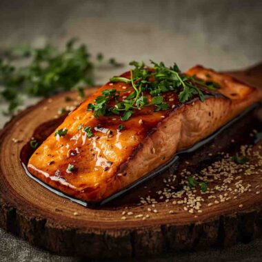 • Step 2: Season and Cook the Salmon : Option 1: Pan-Seared Salmon Heat olive oil in a large skillet over medium-high heat. Pat salmon dry, then season with salt and pepper. Place salmon skin-side down and cook for 4–5 minutes, then flip. Pour the sauce into the skillet and cook for another 2–3 minutes, spooning it over the salmon as it thickens and coats. Option 2: Baked Salmon Preheat oven to 400°F (200°C). Place salmon on a lined baking tray, brush with sauce, and bake for 12–14 minutes. Broil for an additional 1–2 minutes for a caramelized glaze.