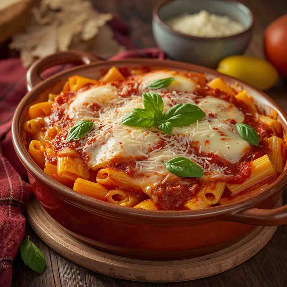 Baked Ziti Pasta with Mozzarella and Marinara is the ultimate Italian-American comfort food — a warm, cheesy, and hearty baked pasta dish that brings family and friends together around the table.