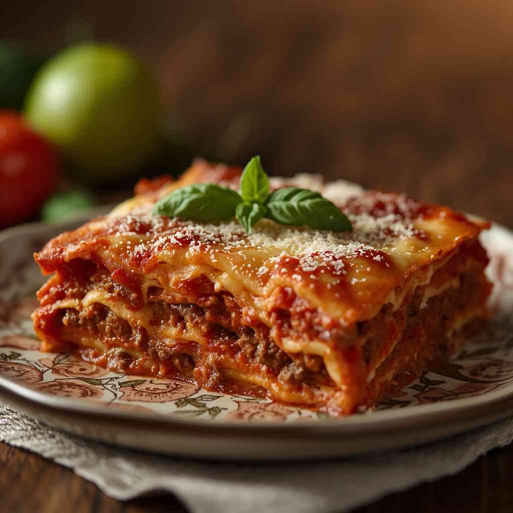 - Step 4: Assemble the Lasagna : Preheat oven to 375°F (190°C). In a 9×13-inch baking dish, spread a thin layer of meat sauce on the bottom. Arrange 3–4 noodles over the sauce. Spread ⅓ of the ricotta mixture evenly. Add ⅓ of the meat sauce and sprinkle with mozzarella and Parmesan. Repeat layers (noodles → ricotta → sauce → cheese) two more times. Finish with a final layer of noodles, sauce, and the remaining cheese.