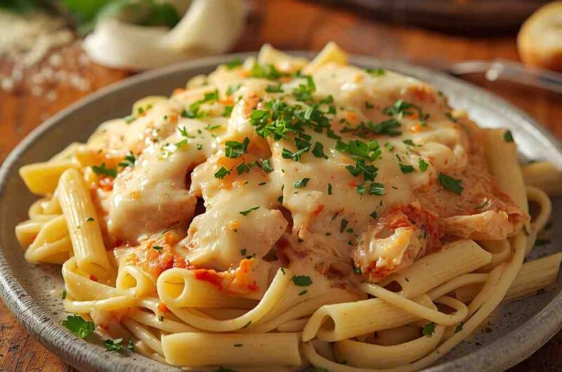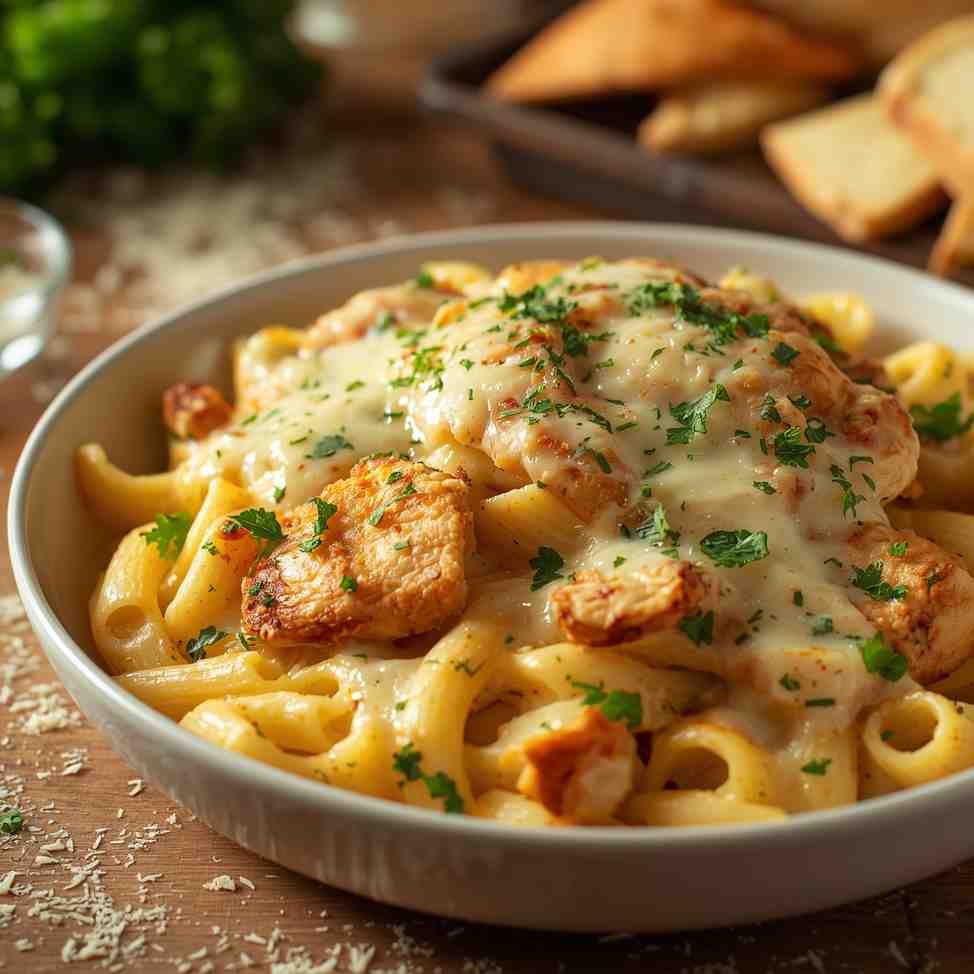 This recipe is a must-try because it delivers everything you want in a pasta meal—creamy texture, bold garlic flavor, melted cheese, and protein all in one pan. It’s the kind of recipe that quickly becomes a family favorite because it feels indulgent without requiring complicated steps. The sauce is velvety, the chicken flavorful, and the baked finish adds irresistible texture. Whether you’re impressing guests or feeding picky eaters, this dish checks every box for comfort, taste, versatility, and practicality.
