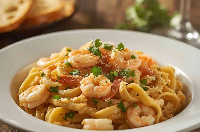 • Step 4: Combine Everything : Return cooked pasta and shrimp to the skillet. Toss gently until everything is well coated in the creamy sauce. Simmer for 2–3 minutes until heated through. Sprinkle with fresh parsley before serving.