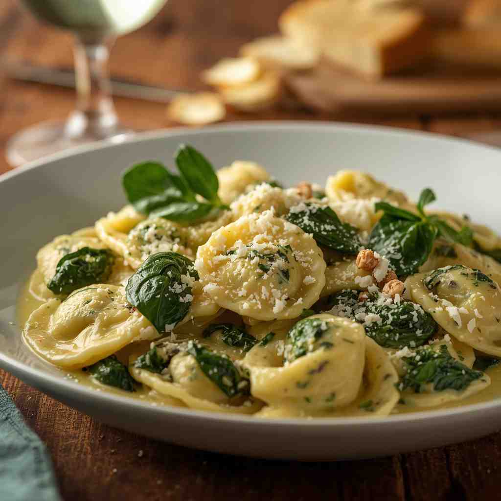 Serve Creamy Spinach Tortellini with Garlic Butter hot, straight from the pan into warm bowls.