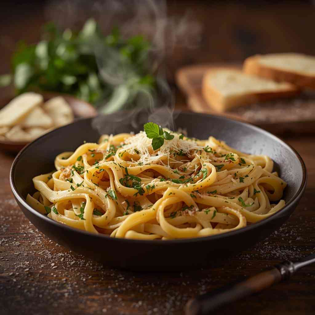 Boil the fettuccine until al dente, then toss it in a creamy garlic-Parmesan sauce made with butter, cream, and cheese. Finish it with a mix of fresh herbs for brightness and serve hot with a sprinkle of extra Parmesan and pepper.