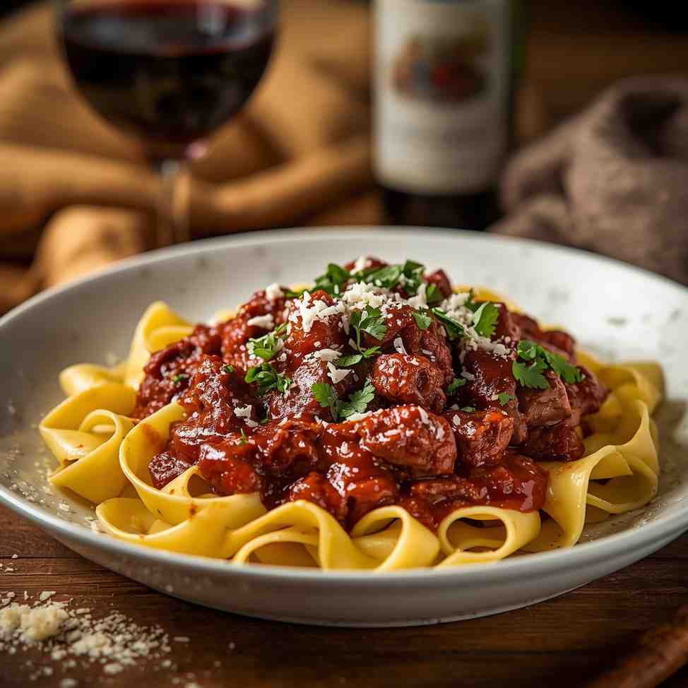 - Cook pappardelle, toss with ragù, and serve with Parmesan and olive oil.