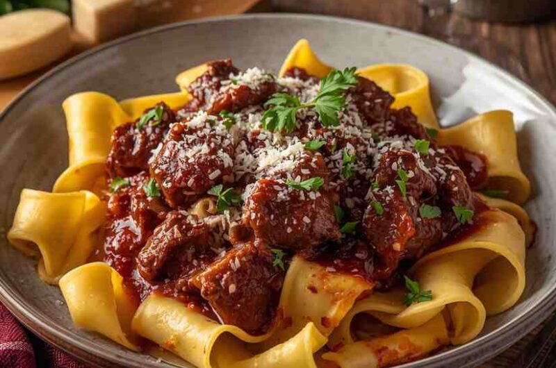 - Cook pappardelle, toss with ragù, and serve with Parmesan and olive oil.