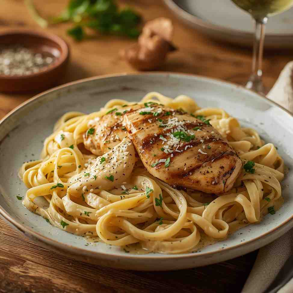 - Step 5: Combine Everything : Add cooked pasta into the sauce and toss until evenly coated. Add sliced chicken on top and gently mix. Garnish with parsley and extra Parmesan before serving.