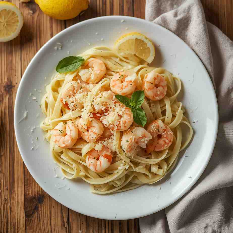 Serve Shrimp Alfredo Tagliatelle with Lemon immediately while warm and creamy. Plate the pasta elegantly in shallow bowls, ensuring each serving has generous portions of shrimp.