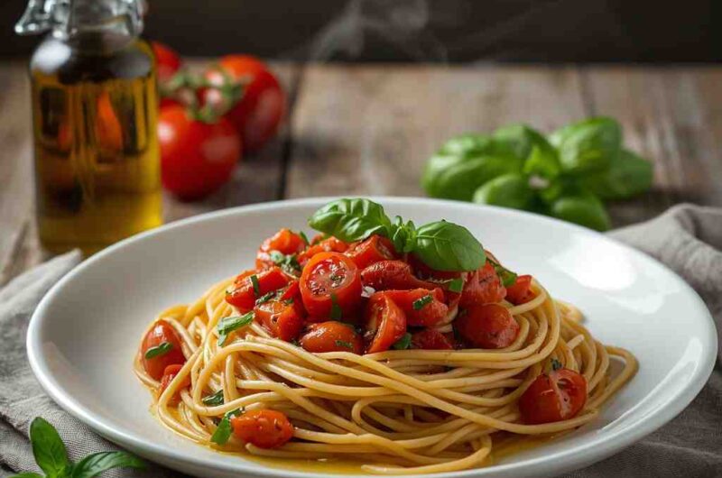 Tomato and Basil Spaghetti with Olive Oil is a dish that celebrates the purity of Italian cooking — simple ingredients, minimal fuss, and maximum flavor. The sweetness of ripe tomatoes, the freshness of basil, and the richness of olive oil come together to create a pasta that’s comforting yet refreshing.