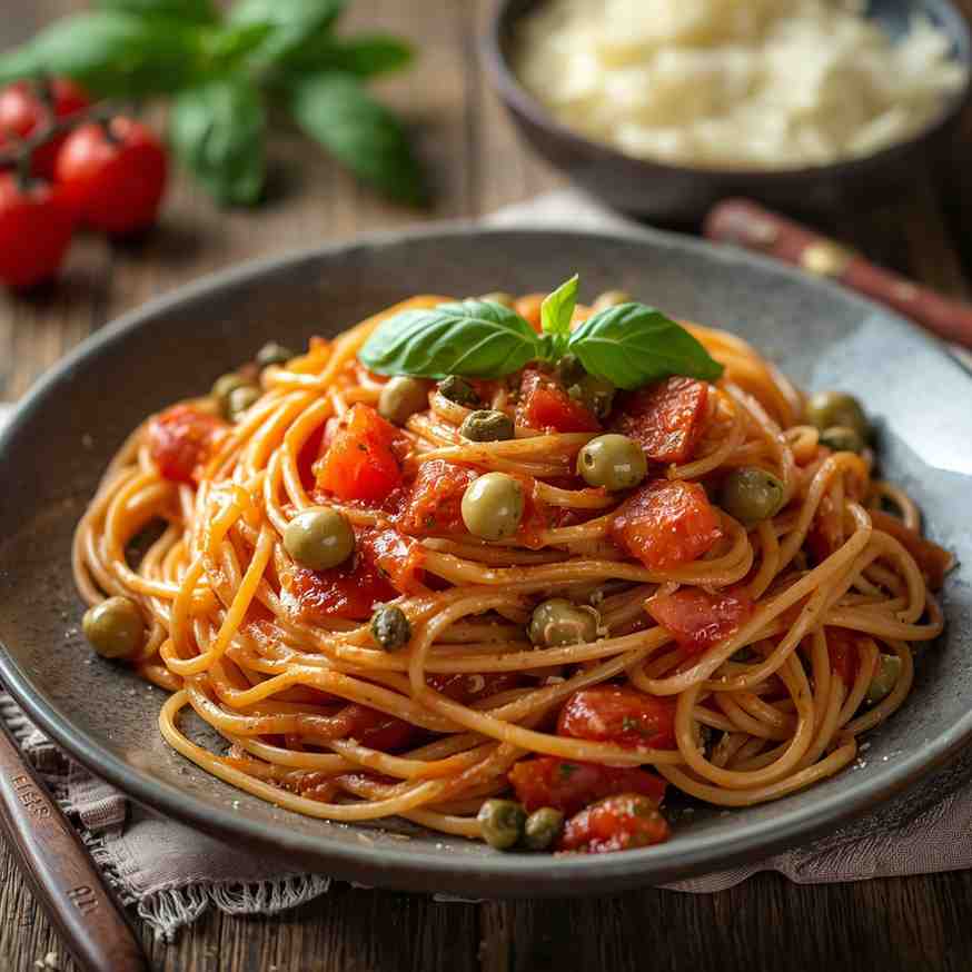 Cook spaghetti until al dente, prepare a rich tomato-olive-caper sauce, toss pasta in the sauce, finish with fresh basil, and serve hot with olive oil drizzle and optional Parmesan.