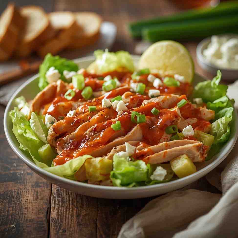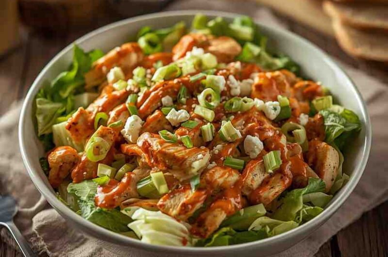 The magic of this salad lies in its balance: juicy buffalo chicken breast coated in a tangy, spicy sauce paired with crisp lettuce, cooling ranch or blue cheese dressing, crunchy vegetables, and just enough extras — like avocado, cheese, or croutons — to make it feel indulgent.