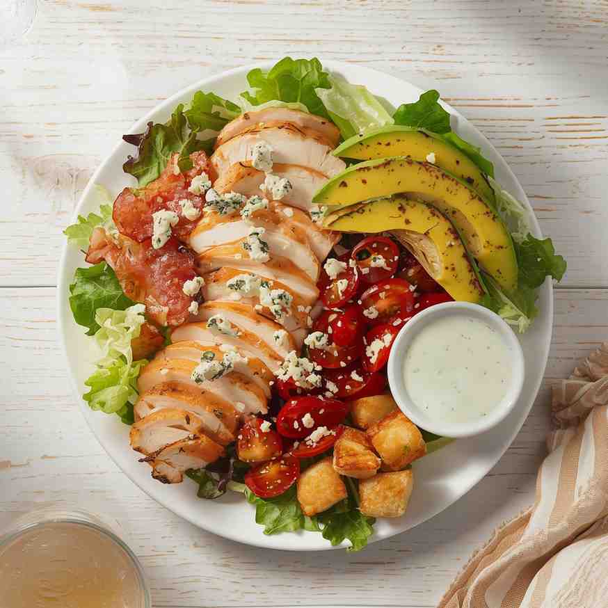 - Assemble the Salad : Place a bed of lettuce in a large salad bowl or platter. Arrange toppings in rows: chicken, eggs, bacon, tomatoes, avocado, onions, and cheese for a classic Cobb presentation.