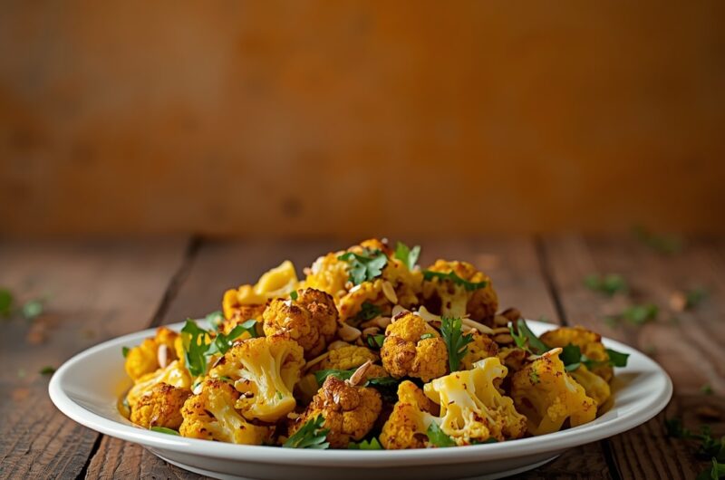 - Roast the Cauliflower Preheat oven to 425°F (220°C). In a large mixing bowl, toss the cauliflower florets with olive oil, curry powder, cumin, turmeric, garlic powder, salt, and pepper. Spread the seasoned cauliflower on a baking sheet lined with parchment paper. Roast for 25–30 minutes, flipping halfway through, until golden and slightly crispy on the edges. Set aside to cool slightly.