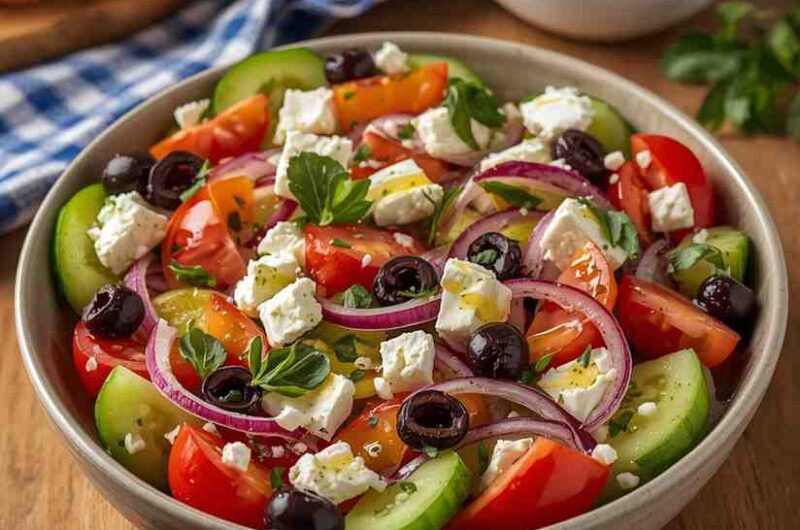 Greek Salad with Feta and Olives is a fresh, healthy, and flavorful salad that brings the taste of the Mediterranean to your table. It’s easy to prepare, versatile, and packed with vibrant colors and textures. Perfect as a side dish, lunch, or light dinner, this salad is a must-try for anyone who loves crisp vegetables, tangy feta, and the bold flavors of olives and lemon. Quick, delicious, and refreshing, it’s a salad that will become a regular in your recipe rotation.