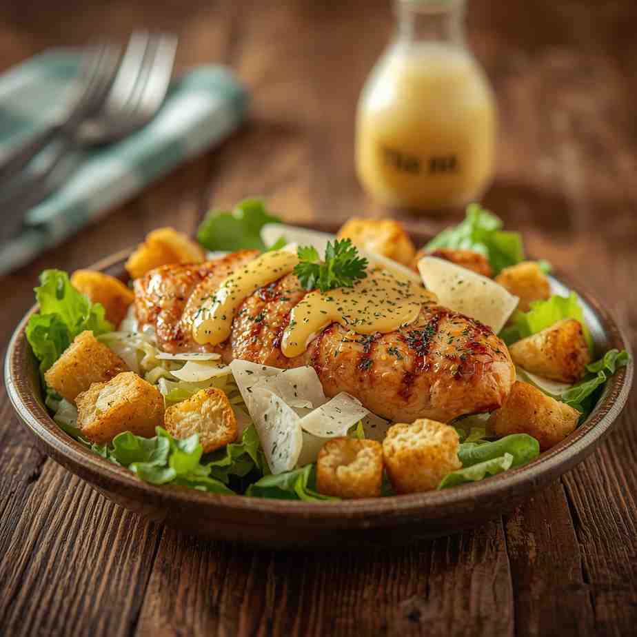 • Step 4: Assemble the Salad : Add chopped romaine to a large bowl. Toss lightly with some dressing. Top with grilled chicken slices, croutons, and extra Parmesan. Drizzle additional dressing if desired.