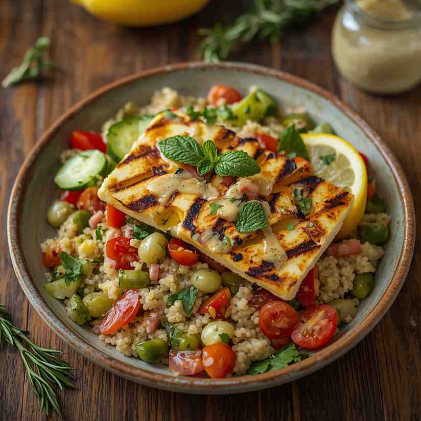 Grilled Halloumi and Couscous Salad is a vibrant and wholesome dish that combines the salty, squeaky texture of grilled halloumi with fluffy, tender couscous, fresh vegetables, and a zesty lemon-herb dressing. This Mediterranean-inspired salad is both satisfying and refreshing, making it perfect for a light lunch, dinner, or as a side dish for gatherings.