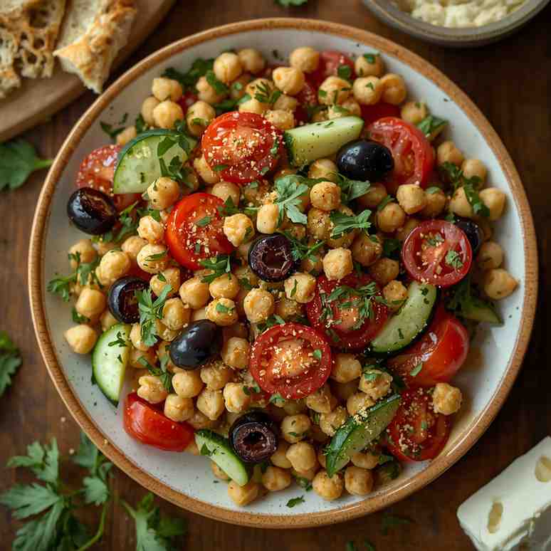 Serve Mediterranean Chickpea Salad as a light lunch, a side dish for grilled meats or fish, or as part of a mezze spread. It pairs beautifully with pita bread, hummus, or roasted vegetables. This salad also works well as a packed lunch or picnic dish, as it holds up well without wilting.