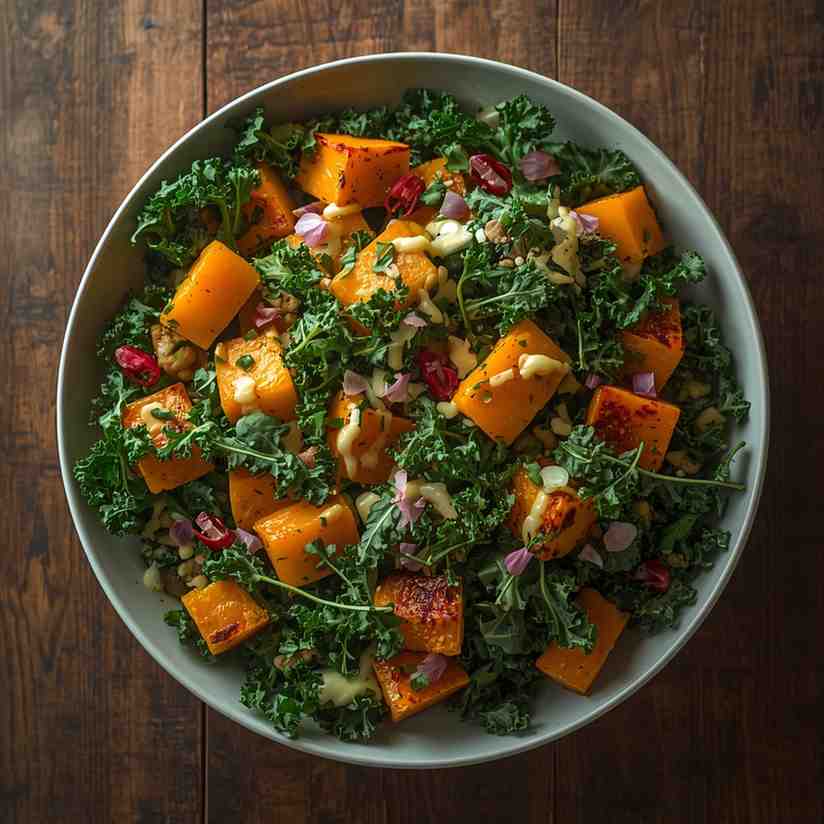 The sweetness of the caramelized butternut squash pairs beautifully with the hearty texture of kale, while toasted nuts, dried cranberries, and a bright tangy dressing enhance the overall taste with depth and contrast.