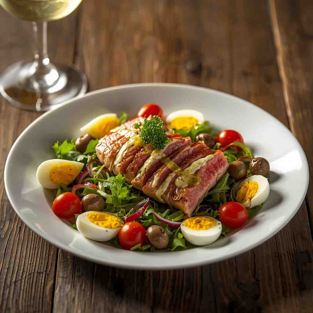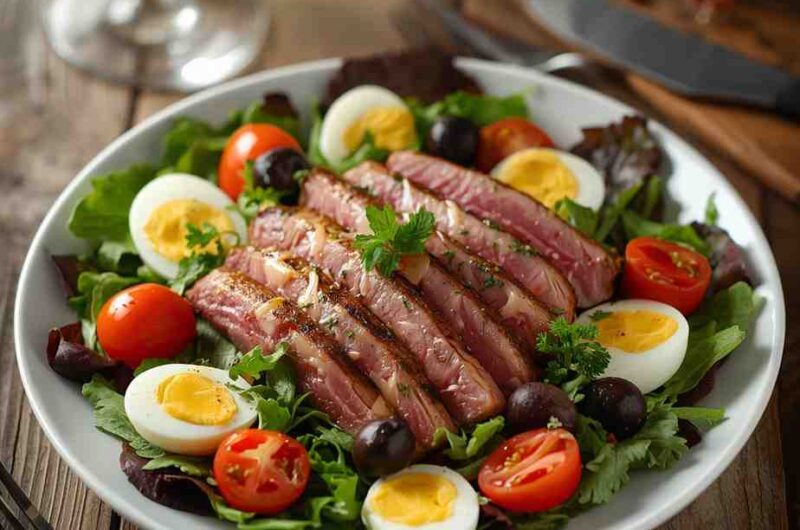 It combines tender tuna—either seared fresh or high-quality canned—along with crisp green beans, soft-boiled eggs, tomatoes, olives, potatoes, and a delicious Dijon vinaigrette. Every bite brings a mix of flavors: salty, briny, bright, and herbaceous. This dish feels luxurious yet wholesome, offering both elegance and comfort in a single bowl.
