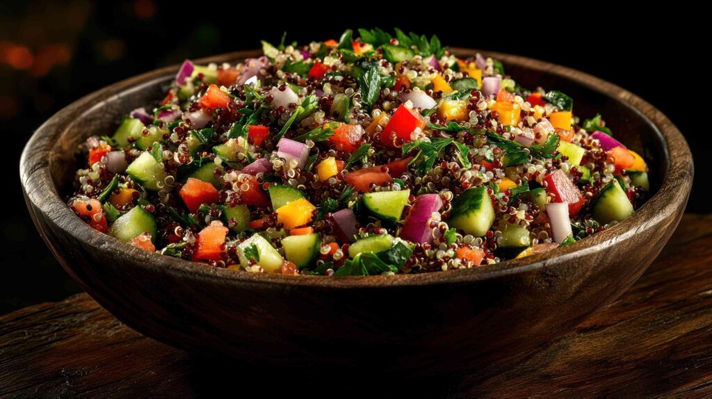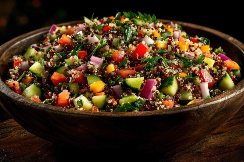 This Fresh Quinoa Salad isn’t just visually appealing; it’s also incredibly nutritious. One serving contains a healthy balance of macronutrients that support overall well-being. Quinoa provides ample protein and fiber, which are essential for muscle repair and digestive health, respectively. The crunchy vegetables contribute various vitamins such as vitamin C, and antioxidants that combat oxidative stress.