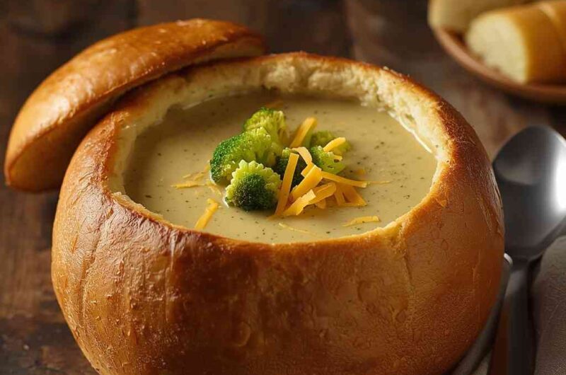 “Broccoli Cheddar Soup in a Bread Bowl” is a classic comfort dish that’s fun, indulgent, and perfect for all ages. The creamy, cheesy soup pairs perfectly with the crusty bread, creating a meal that’s both satisfying and cozy.