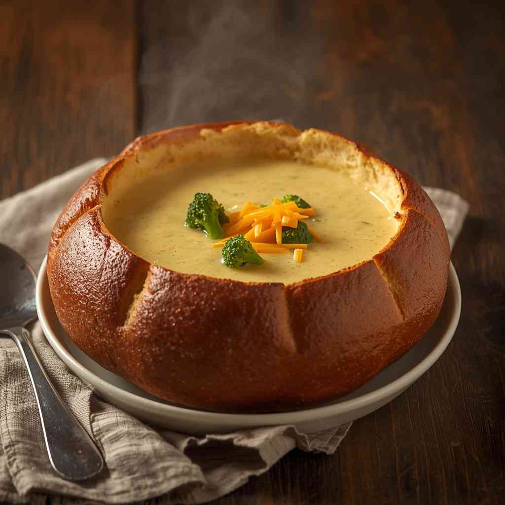• Step 7: Assemble and Serve : Ladle the hot broccoli cheddar soup into the prepared bread bowls. Garnish with extra shredded cheese, parsley, or croutons. Serve immediately.