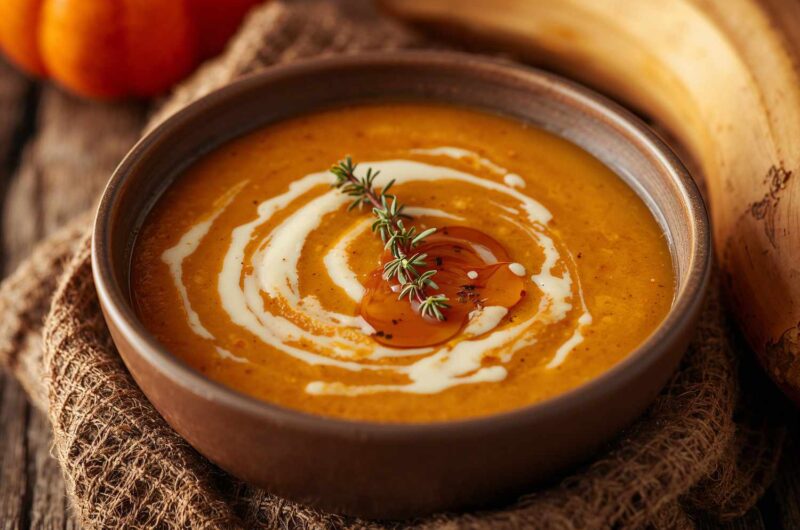 Maple Roasted Acorn Squash Soup with Thyme is a silky, comforting, and autumn-inspired soup that combines the natural sweetness of roasted acorn squash with the warm, earthy flavor of fresh thyme. A touch of pure maple syrup enhances the roasted flavors, creating a soup that is both naturally sweet and savory. This vibrant orange soup is perfect as a starter for holiday meals, a cozy weeknight dinner, or a healthy lunch.