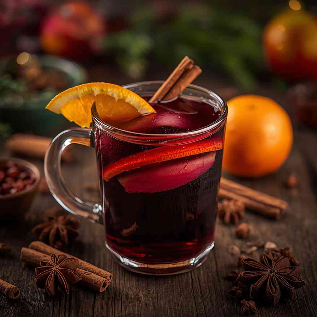 - Step 5: Strain and Serve : Strain out the spices and orange slices, pour the mulled wine into mugs or heatproof glasses, and garnish with a fresh orange slice and a cinnamon stick.
