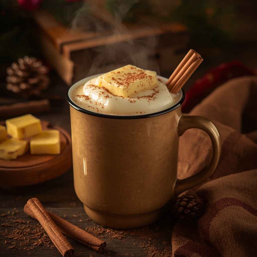 Make a spiced butter mixture using butter, brown sugar, and spices. Add a spoonful to a mug, pour in dark rum, and top with hot water. Stir until melted and fragrant. Garnish with cinnamon and enjoy warm!